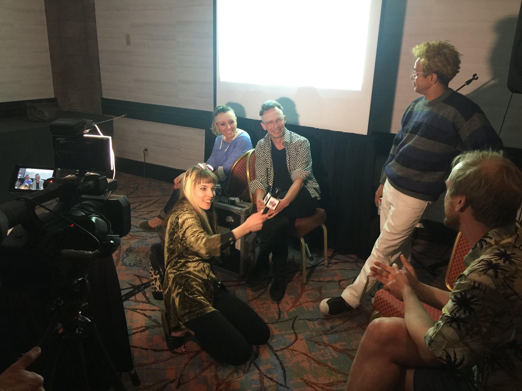 EEG was recorded with a bipolar montage of electrodes attached to the front and back of the head. Alpha power (8-12Hz) was automatically calibrated over time (using our new historycontrol module, completed the night before) and controlled the output voltages of the Endorphin.es‘ Shuttle Control. The Disting Mk4 by Expert Sleepers was then used to add some slew to the signal (i.e. to smooth it) and was then patched into the waveform control of the Wavetable oscillator by Erica Synths. In short, our kind participant was then able to change the timbre of the sound with their attention. And yes, she certainly had moments when she felt in control of the sound, especially, as she put it so nicely: when she was in between total relaxation and concentration to the sound. The picture above shows the EEGsynth crew being interviewed for TV in Arizona in 2016.