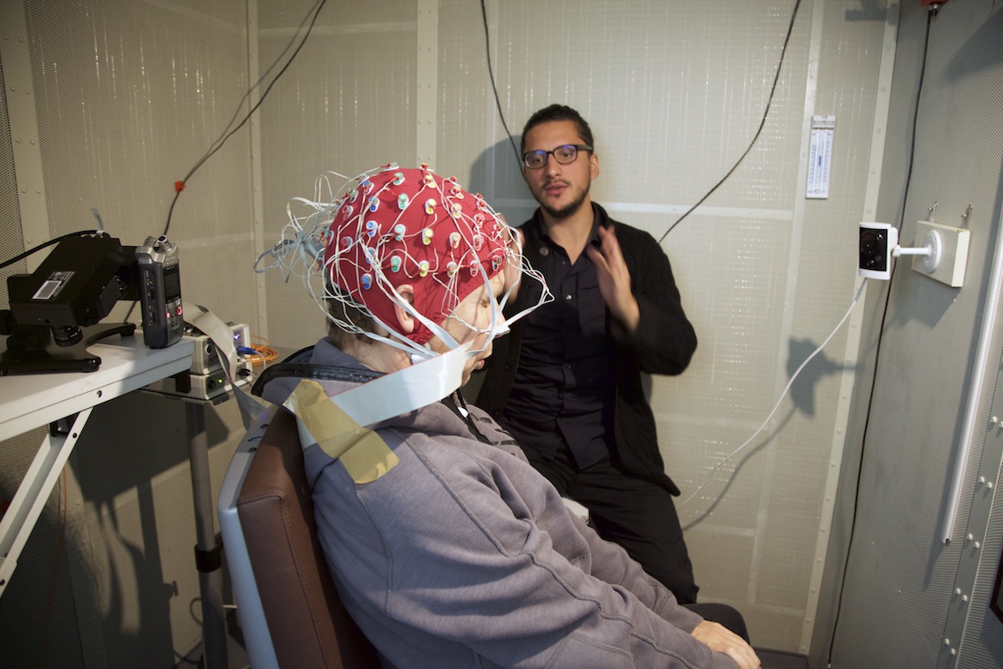 After the successful launch of the Brain Control Club in October, Vision Forum now develop a collaboration with École Normale Superieur in Paris. We have started recording Per Huttner’s brainwaves under hypnosis together with hypnotist and neuroscientist Hernan Anllo. The signals will first be treated by his colleague Stephen Whitmarsh using the EEGsynth and they will be used as a starting point for a musical composition by Jean-Louis Huhta. This recording will be the A-side of a 7″ single that 1+1=3 will release in 2017. For the B-side, Huttner will listen to the recording, again under hypnosis, this second recording will be treated by Whitmarsh and they will be used for a second musical composition by Huhta.